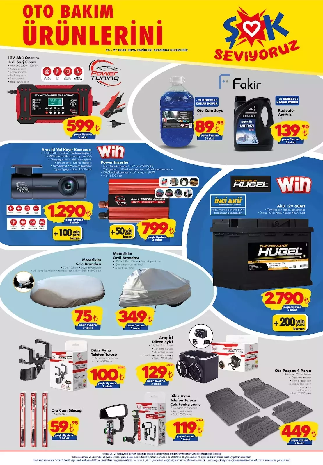 24–27 Ocak kataloğunda oto ürünleri de önemli yer tutuyor. Özellikle kış aylarında araç güvenliği ve bakımına yönelik ürünler öne çıktı: